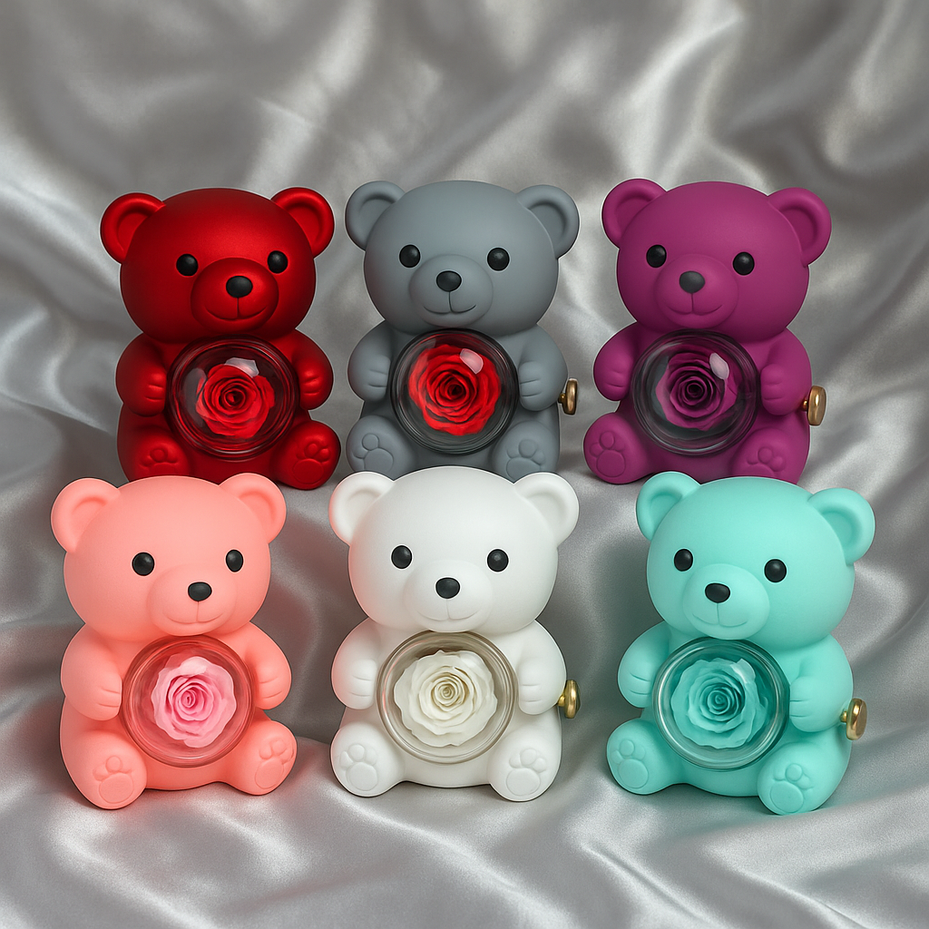 Inside this beautiful box there is a, delicate roses bloom with timeless elegance, while a soft teddy bear stands as a symbol of comfort, warmth, and care. With a gentle rotation, the box becomes more than just a gift; it becomes an unforgettable experience.